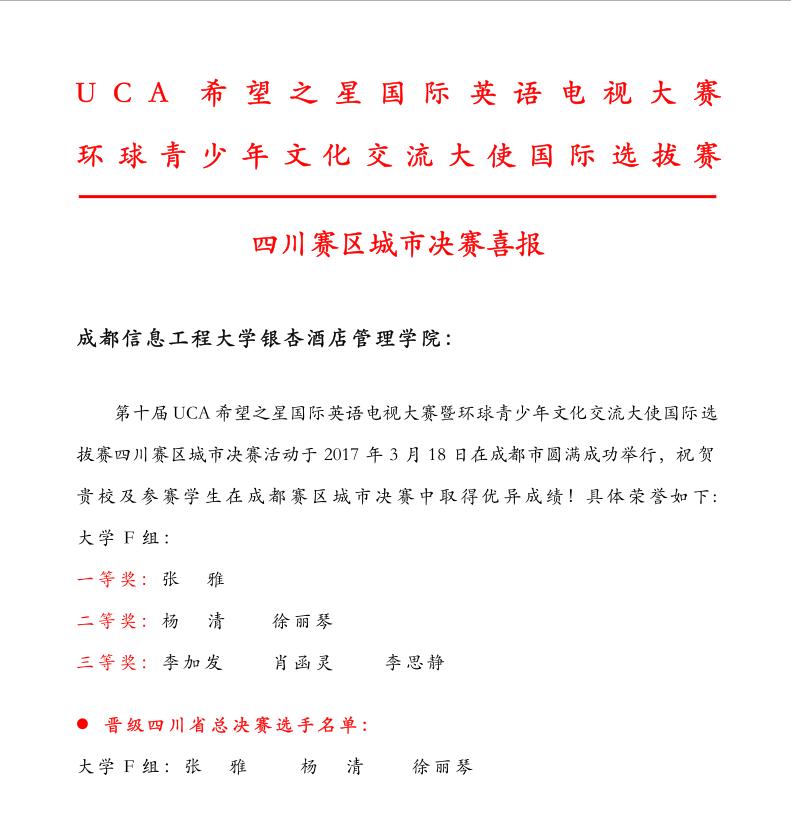 我院外语系成功地组织了第十届UCA希望之星国际英语电视大赛——环球青少年文化交流大使选拔赛学院决赛,选拔出优秀选手代表我院参加了此次大赛的城市决赛。外语系学生张雅、杨清,酒店管理系学生徐丽琴三位同学,在此次大赛的城市决赛中均取得优异成绩,顺利晋级四川省总决赛。